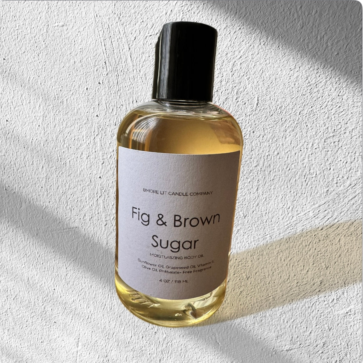 Our moisturizing body oil is a perfect blend of sunflower oil, grapeseed oil, vitamin E oil, and olive oil. All are known for their hydrating properties. Fig & Brown Sugar is a warm scent with a hint of sweet. Our moisturizing body oil should be used 10 minutes after a shower of bath for best results.